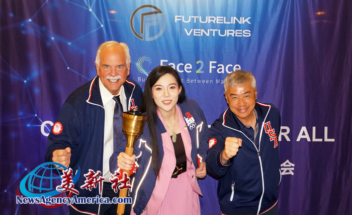 与奥运火炬合影(左起):四枚奥运金牌得主 John Naber、Wendy Wang、American Chinese Athlete Association 会长 Peter Gao
