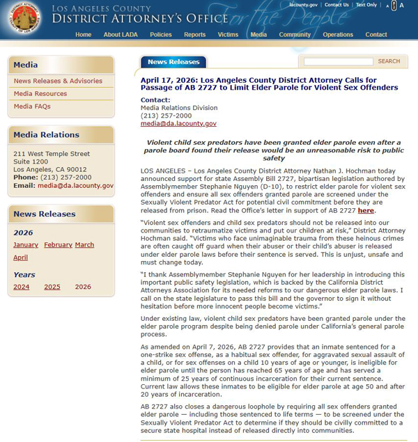 【美新社讯】4月17日,洛杉矶郡地区检察长(LADA)霍赫曼(Nathan J. Hochman)办公室发布公告:支持州议会第 2727 号法案(AB 2727)。这是一项由州众议员 Stephanie Nguyen(民主党,第 10 选区)起草的两党立法,旨在限制针对暴力性犯罪者的“老年假释”适用范围,并确保所有获准假释的性犯罪者在出狱前,均须依据《性暴力掠夺者法案》(Sexually Violent Predator Act)接受筛查,以判定其是否符合被处以民事收容(civil commitment)的条件。