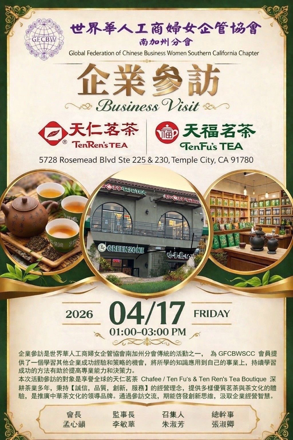 【美新社訊】世界華人工商婦女企管協會南加州分會於2026年4月17日(星期五)下午1時至3時,盛大舉行一年一度備受期待的「企業參訪」活動。