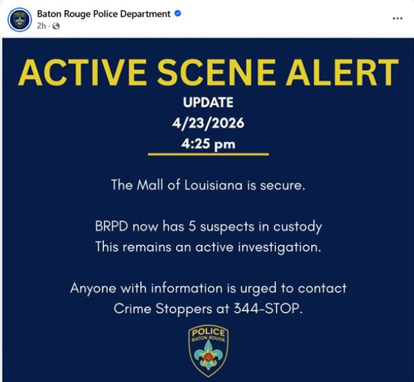 “我已经获悉路易斯安那购物中心发生的枪击事件。我正与执法部门保持协调,一旦掌握更多信息,我们将及时发布最新通报。请大家避开该区域。