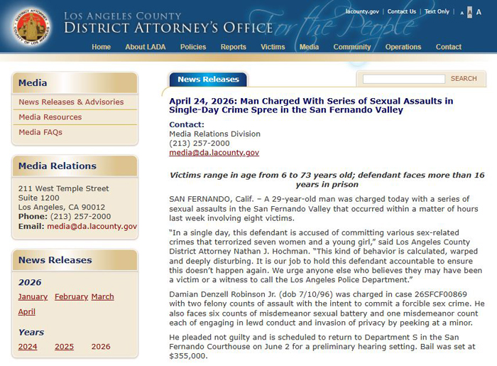 【美新社讯】4月24日周五,洛杉矶郡地区检察长(LADA)霍赫曼(Nathan J. Hochman)办公室发布公告:一名29岁的男子被指控在圣费尔南多谷(San Fernando Valley)地区实施了一系列性侵犯行为;这些罪行发生于上周某天的短短数小时内,共涉及八名受害者,年龄从6岁到73岁不等。