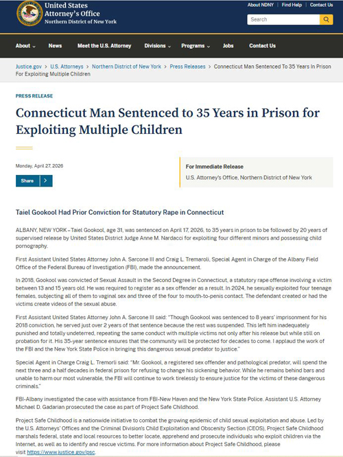 【美新社讯】4月27日周一,美国司法部(DOJ)公告披露:现年31岁的康涅狄格州男子 Taiel Gookool 于2026年4月17日被美国联邦地区法官 Anne M. Nardacci 判处 35 年监禁,刑满释放后还将接受 20 年的监督释放。此前,他因剥削四名未成年人并持有儿童色情制品而被定罪。
