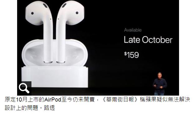 《華爾街日報》披露,AirPod可能在開發上有根本問題尚未解決。一般無線耳機,是由單邊耳機接收無線藍芽訊號,再傳輸到另一個耳機同時發聲,與AirPod的設計不同。根據蘋果最初的設計,AirPod兩邊耳機應可獨立接收訊號,如果耳機間訊號無法即時同步,時間差將造成聲音失真。