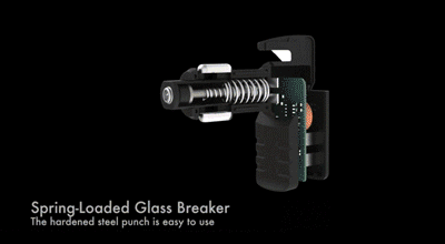 而另一功能就是,与点烟器连接的部位,其实还是一个破窗器,只需贴于车窗玻璃用力按压,靠其内部弹簧的力量即可将玻璃轻松击破,逃生窗口就此打开,毫不费力的操作,就连女生们也可轻易操作!
